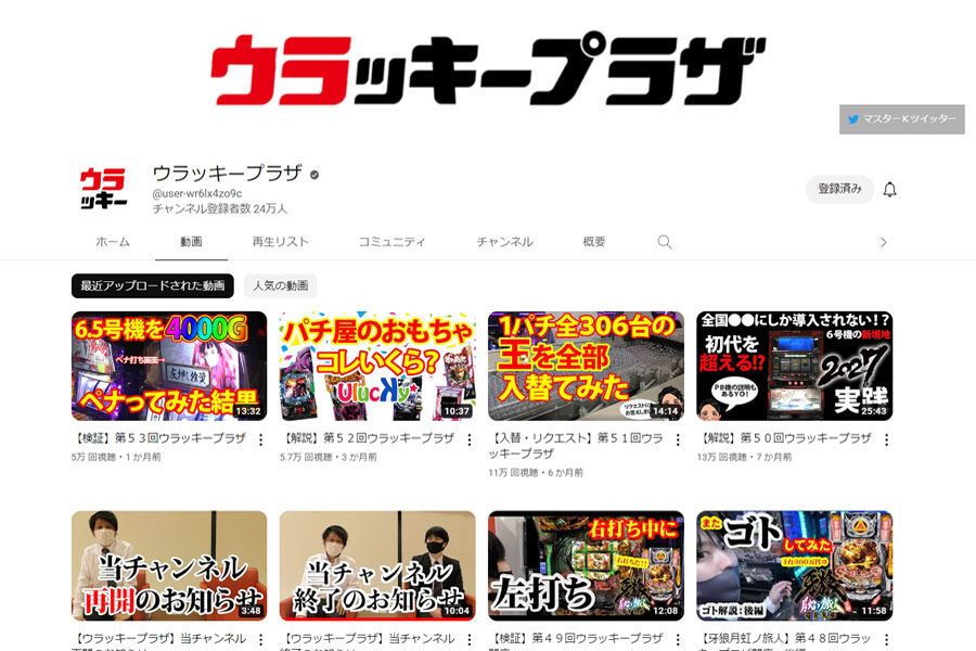 パチンコホール系YouTubeチャンネルの中で最も登録者数が多いのは「ウラッキープラザ」【パチンコ動画ウォッチャー】